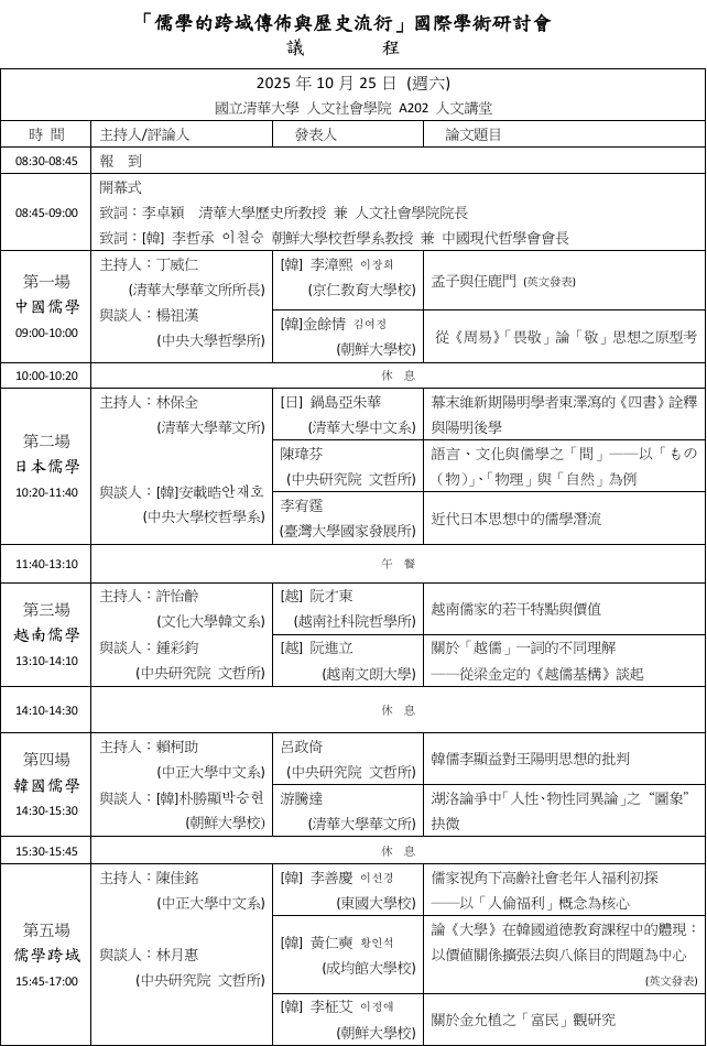 本次於2025年10月25日假國立清華大學人文社會學院A202人文講堂舉辦國 際學術會議。計有二十九位來自韓國、越南、日本,乃至臺灣本地的專家學者一同 出席會議,以及學術界的師友同道、各級學校教職人員、國內的碩博士研究生等總 計一百一十餘人一同參與了這場學術活動。除了強化東亞儒學研究的深度與廣度 外,也能擴大臺灣學術研究成果以及清華大學在國際的知名度、能見度。