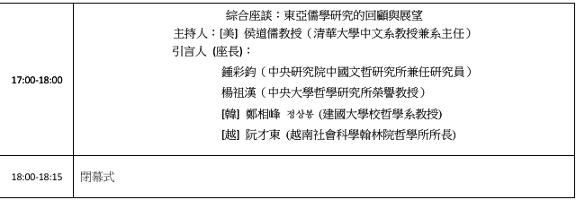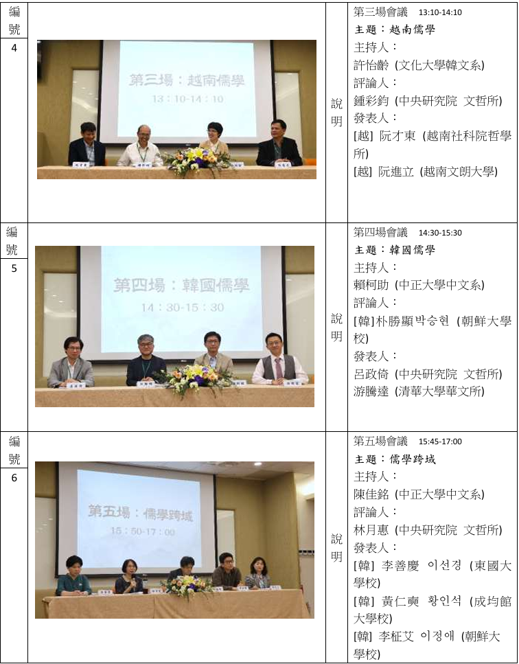 本次學術會議邀集韓國學者、日本學者、越南學者以及臺灣本地的學者,共計二 十九名,大家齊聚一堂,一同針對「東亞儒學」的學術議題發表最新研究心得,交流觀點與意見。這般能廣納各國儒學研究專家的學術會議實屬難得,例如在韓國,雖同 樣進行儒學研究,但中國哲學專業與韓國儒家哲學研究專業實屬兩個學術集團;而在 越南,儒教研究則多半被歸入人文社會學科研究中的一支,較罕舉辦專題性的學術會 議。然而在臺灣,基於早期臺灣大學高等研究院黃俊傑教授的大力推動,「東亞儒學」 的研究已行之有年,故此次會議的召開,邀集各國的專家學者與會,是一次最好的相互交流與拓展學術互動的良好契機。