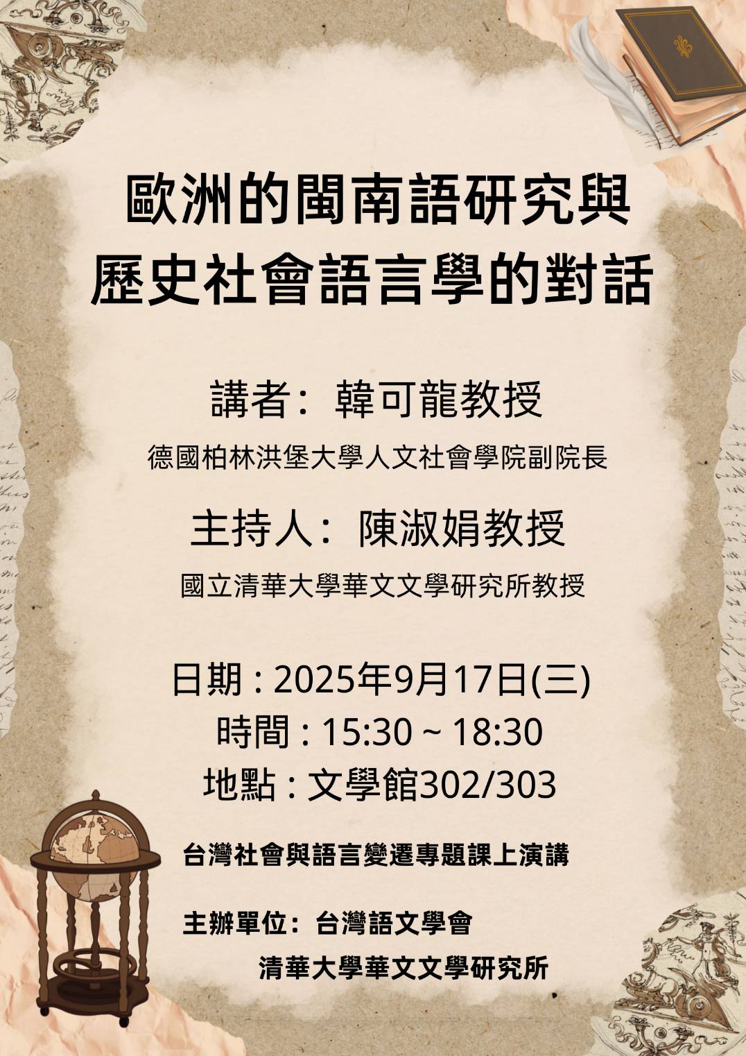 【演講公告】9/17(三)15:30-18:30韓可龍教授(德國柏林洪堡大學人文社會學院副院長)於文學館302/303演講,講題:歐洲的閩南語研究與歷史社會語言學的對話