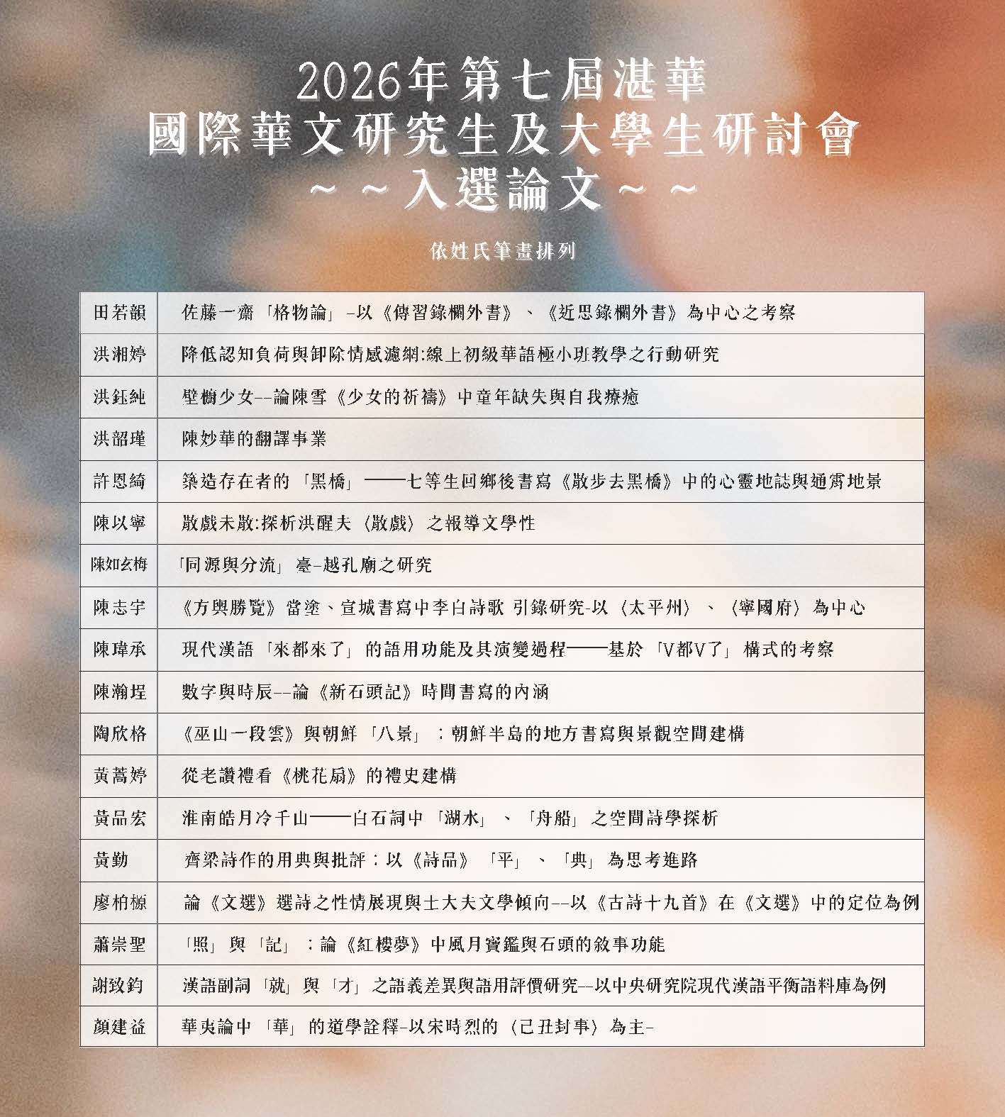 【錄取名單】2026第七屆湛華國際華文研究生及大學生研討會